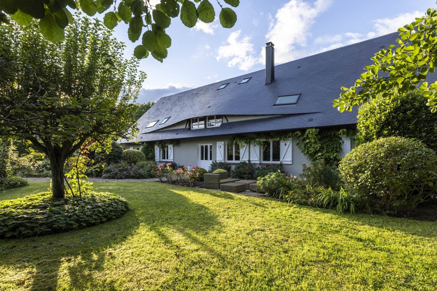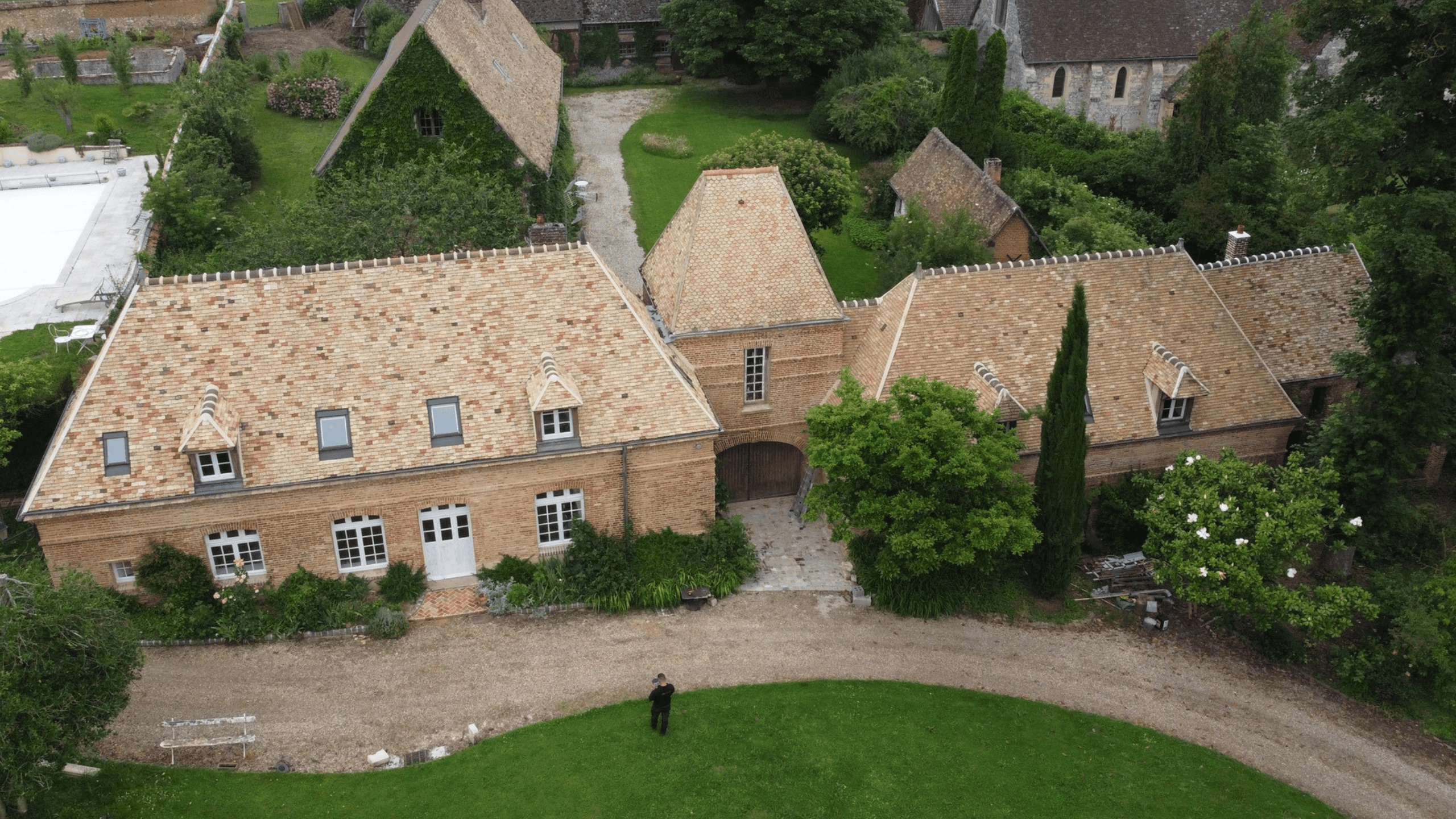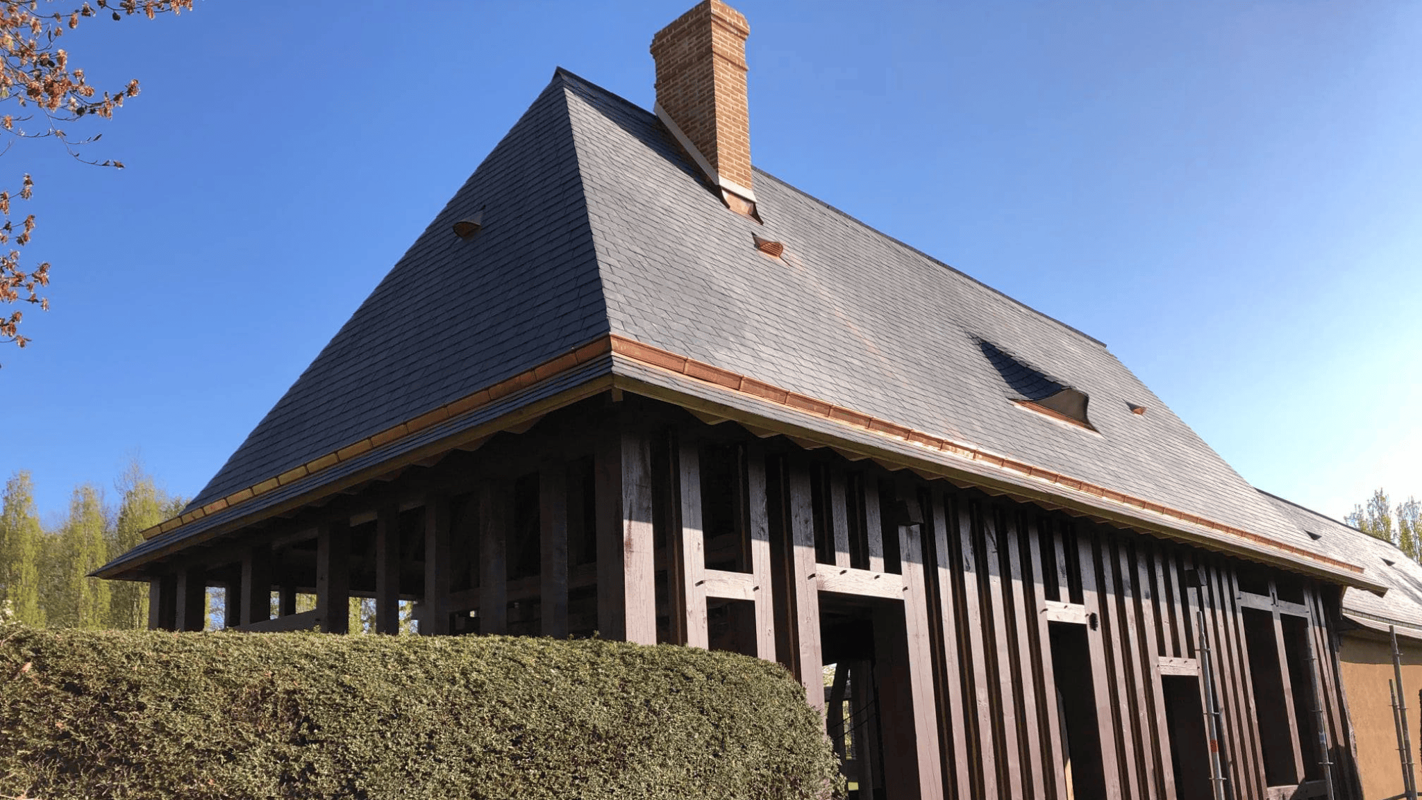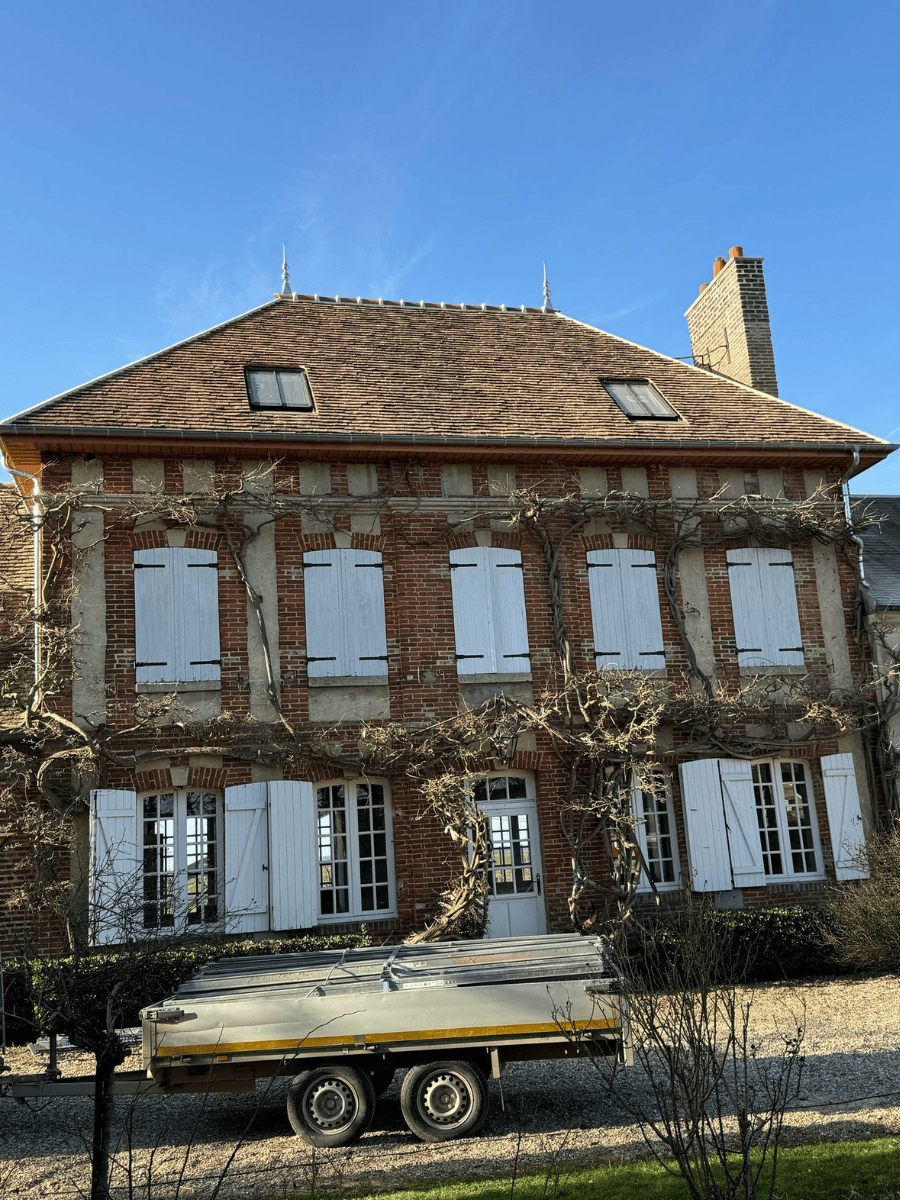 Rénovation de toiture et pose de fenêtres de toit sur une maison de maître en briques en Normandie.