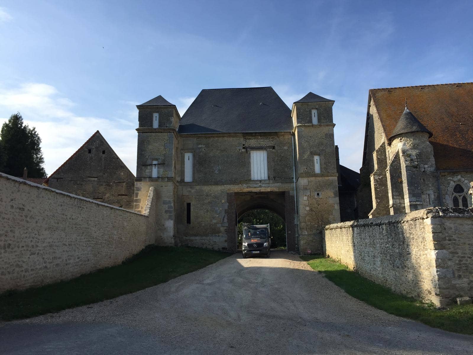 Camion de l'entreprise BM Couverture passant sous le porche d'un édifice historique en pierre