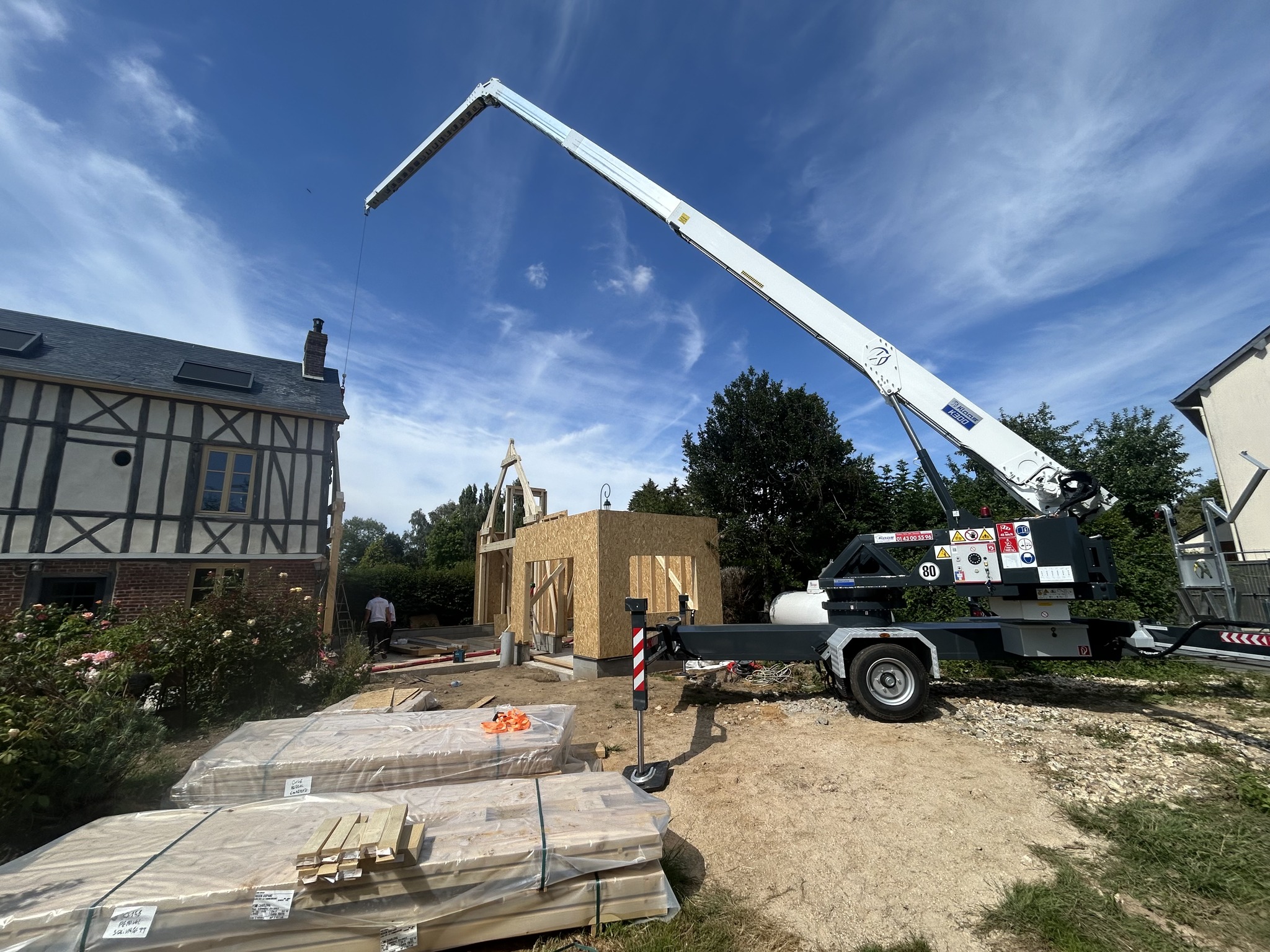 Utilisation d'une grue K300E pour la levée d'une ossature bois par les équipes de BM Couverture.