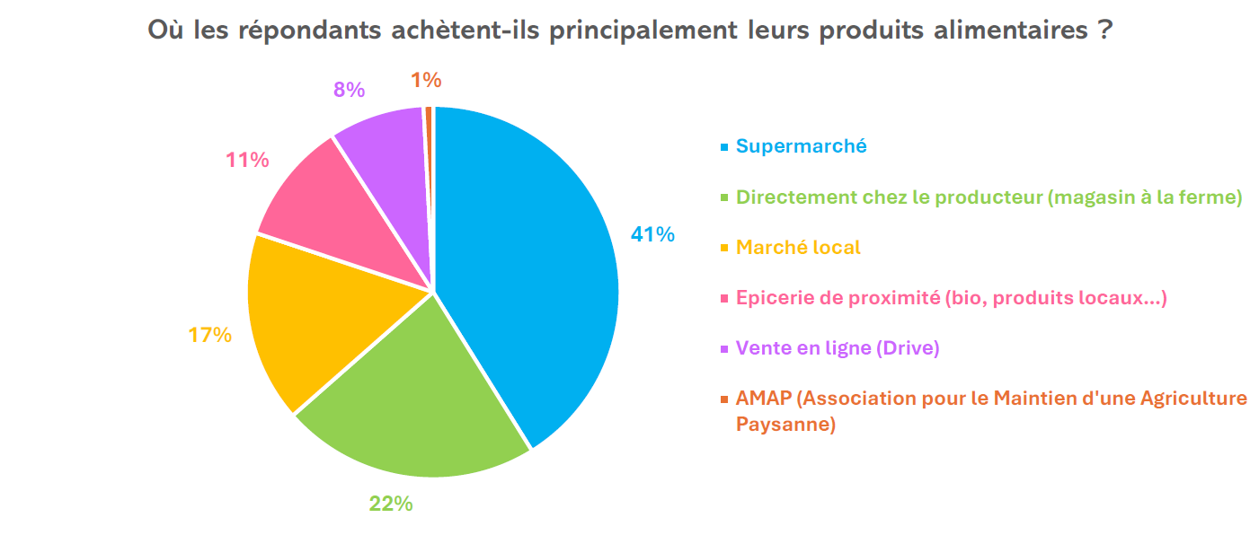 Premier constat : le supermarché garde la main avec 41 % des répondants qui en font leur lieu d’achat principal. Mais il n’écrase pas tout. Un habitant sur cinq (22 %) achète directement à la ferme, 17 % fréquentent les marchés locaux et 11 % passent par des épiceries de proximité. Les AMAP et le drive restent confidentiels, mais présents.