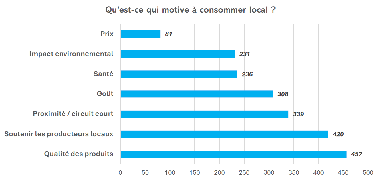 Qu’est-ce qui pousse à consommer local ? La qualité arrive en tête, et le soutien aux producteurs locaux suit de très près. Les circuits courts, le goût, la santé et l’environnement complètent le tableau. À noter : le prix n’est quasiment jamais cité comme une motivation. C’est plutôt lui qui pose problème.