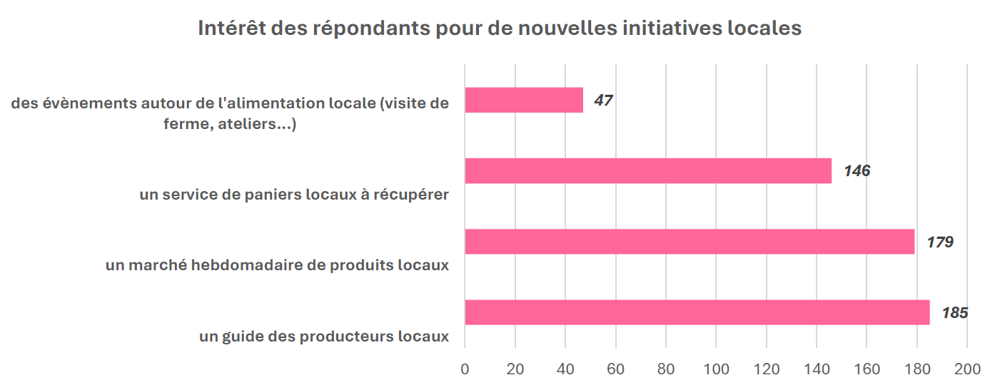 Les habitants connaissent plutôt bien leur territoire : 82 % disent savoir où trouver des producteurs près de chez eux. Mais ils aimeraient aller plus loin. Les propositions qui récoltent le plus d’intérêt sont un guide des producteurs locaux (c’est désormais une réalité ! consultez le en ligne), un marché hebdomadaire dédié et un système de paniers à récupérer. Les événements type visites de fermes ou ateliers culinaires intéressent aussi, mais dans une moindre mesure.